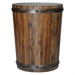 Capturing the essence of an authentic wine barrel, this solid distressed acacia wood piece is finished in a weathered walnut stain, complete with iron sheet metal strapping accented with riveted details in a burnished brushed steel.