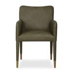 Perfect for modern dining, this armchair features sleek lines covered in a pine green distressed faux leather accented with brushed brass ferrules.