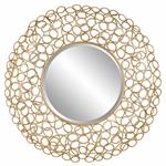 Handcrafted from solid iron, this round features a dramatic 3-dimensional frame made from curled gold leaf details. Mirror features a generous 1 1/4" bevel.